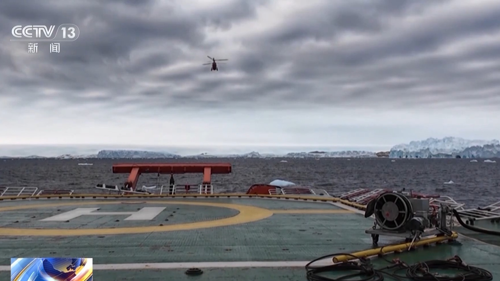 三个月前,中山站附近还是一片海冰,现在已变成了汪洋,几座冰山浮在海上。“雪龙”号停靠在距离中山站10公里的海域。考察队要将航空煤油、食品等物资送上站区,“雪鹰102”直升机成为唯一的运输手段。此时“雪龙”号的在船人员约51名,要将直升机从机库里推出来,几乎要全员上阵推飞机。
