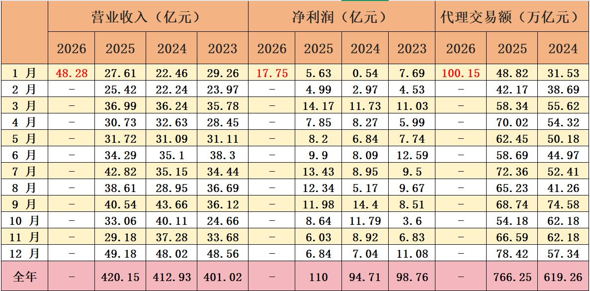 从核心数据来看,2026年1月期货行业迎来历史性爆发:营业收入同比增长 74.86%,已接近2025年12月营收峰值;净利润同比暴涨215.28%,单月盈利规模已接近2024年一季度全行业总和,盈利增速远超营收增速,印证行业盈利质量实现跨越式提升。交易端的翻倍增长是业绩爆发的核心支撑,1月全行业代理交易额突破100万亿元大关,同比实现翻倍,直接带动经纪手续费等基础收入大幅增厚。拉长周期来看,2023~2025年行业营收稳步抬升,2025年净利润同比增长16.14%,展现出独立于权益市场波动的强经营韧性。
